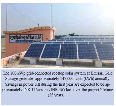 Nhà máy điện quang điện mặt trời trên mái nhà tại kho lạnh Bhusari, Begusarai, sử dụng diện tích mái nhà khoảng 900m2 có sẵn trên sân thượng và phòng thang máy của tòa nhà. Nhà máy điện SPV có công suất 100kWp được kết nối với lưới điện. Không có bộ lưu trữ pin nào được cung cấp. Nó sẽ đáp ứng tải một phần của tòa nhà vào ban ngày.